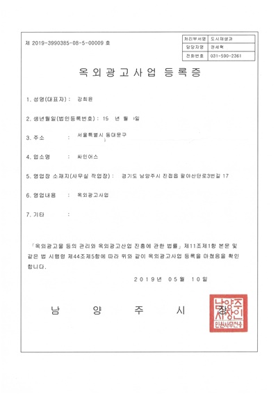 싸인어스는 옥외광고사업등록이 되어있는 옥외 광고 제조 전문 업체입니다.