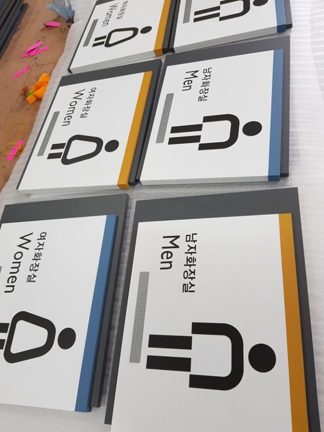 관공서 내부 사인물들 입니다. 화장실, 실명사인 등 입니다. 벽부형은 점자까지 붙여서 제작되었구요, 실명 사인은 돌출형으로 제작되어진 모습입니다. 호실 사인입니다. 아크릴로 제작되었구요. 역시 점자를 붙이기 위한 공간을 시트로 미리 만들어놓은 모습입니다. 요즘 점자는 필수로 들어갑니다. 계단실 표시 사인물 역시 아크릴로 제작되어 시트를 부착하고 점자도 붙여서 제작되었습니다. 포맥스로 제작되어 시트가 부착된 모습입니다. 관공서 부서…