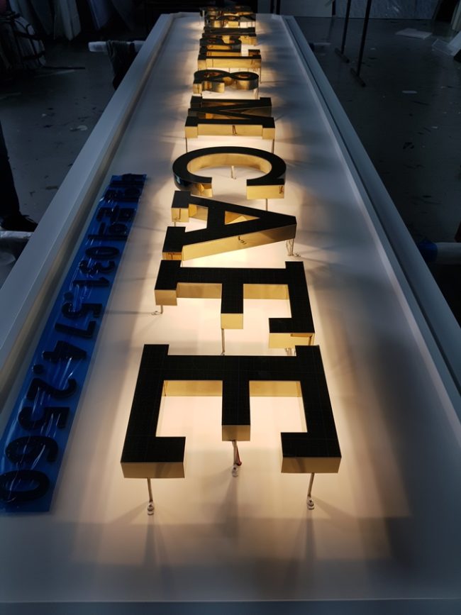 골드스텐 후광채널을 소개합니다. 골드 스텐 헤어라인으로 채널을 만들어 광확산 PC를 붙여주고 뒷면에 엘이디를 넣어주면 깔끔하고 세련된 후광 채널이 완성 됩니다. 골드스텐은 일반 스텐보다 가격이 비싸지만 포인트를 주며 고급스런 느낌을 줄 수 있기 때문에 많이들 이용하십니다. 같은 곳의 골드 헤어라인 채널이지만 어떻게 디자인해서 만드느냐에 따라 다른 느낌을 줄 수 있습니다. D와 H의 느낌을 이렇게 두가지로…