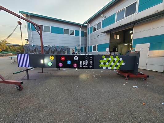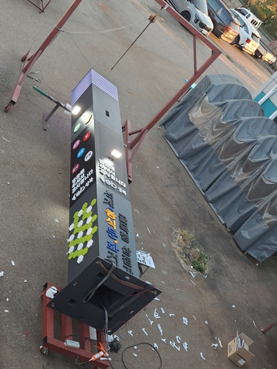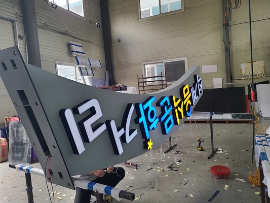 간판의 사면 모두에 아크릴 사인물과 조명을 적용해야 하므로 이렇게 호이스트로 띄워놓고 작업을 진행하였습니다.